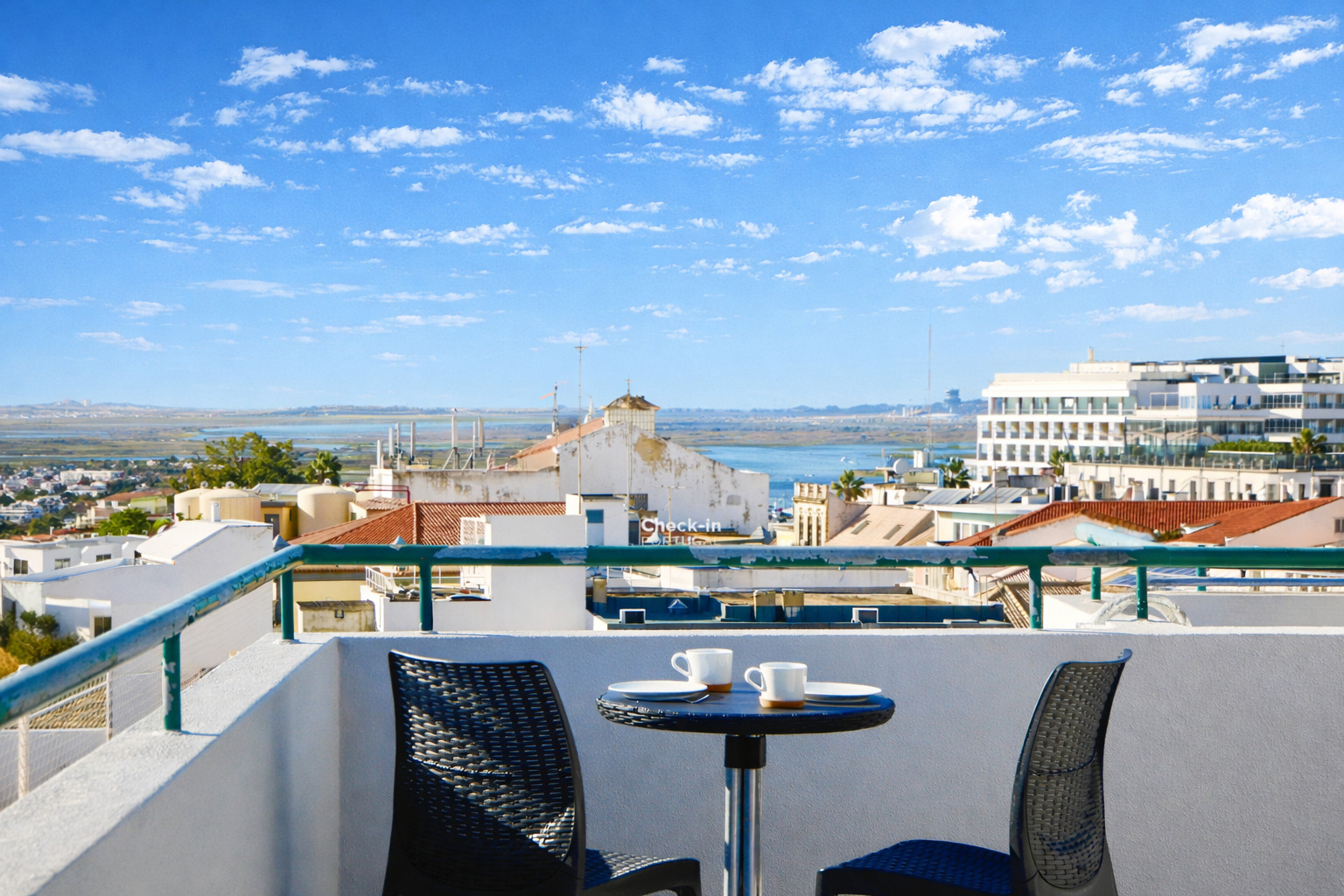• Terraço partilhado no topo do edifício com vista deslumbrante para a cidade e ria formosa.