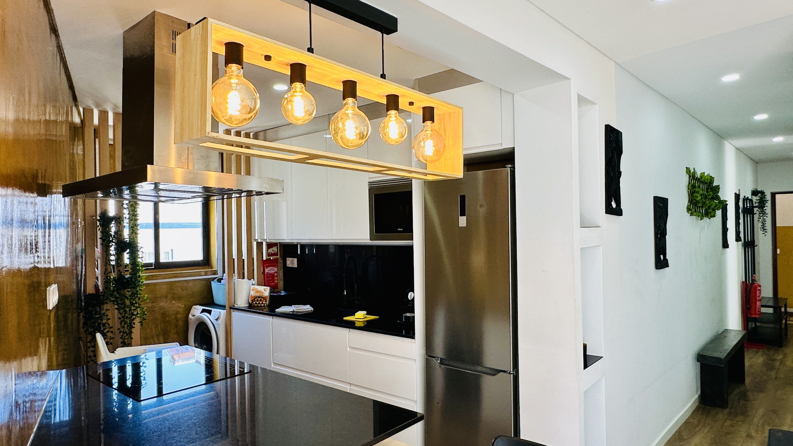 KÜCHE - Offene Küche, komplett ausgestattet mit Geschirrspülmaschine, Waschmaschine, Mikrowelle, Kochfeld, Ofen und allen notwendigen Utensilien.
