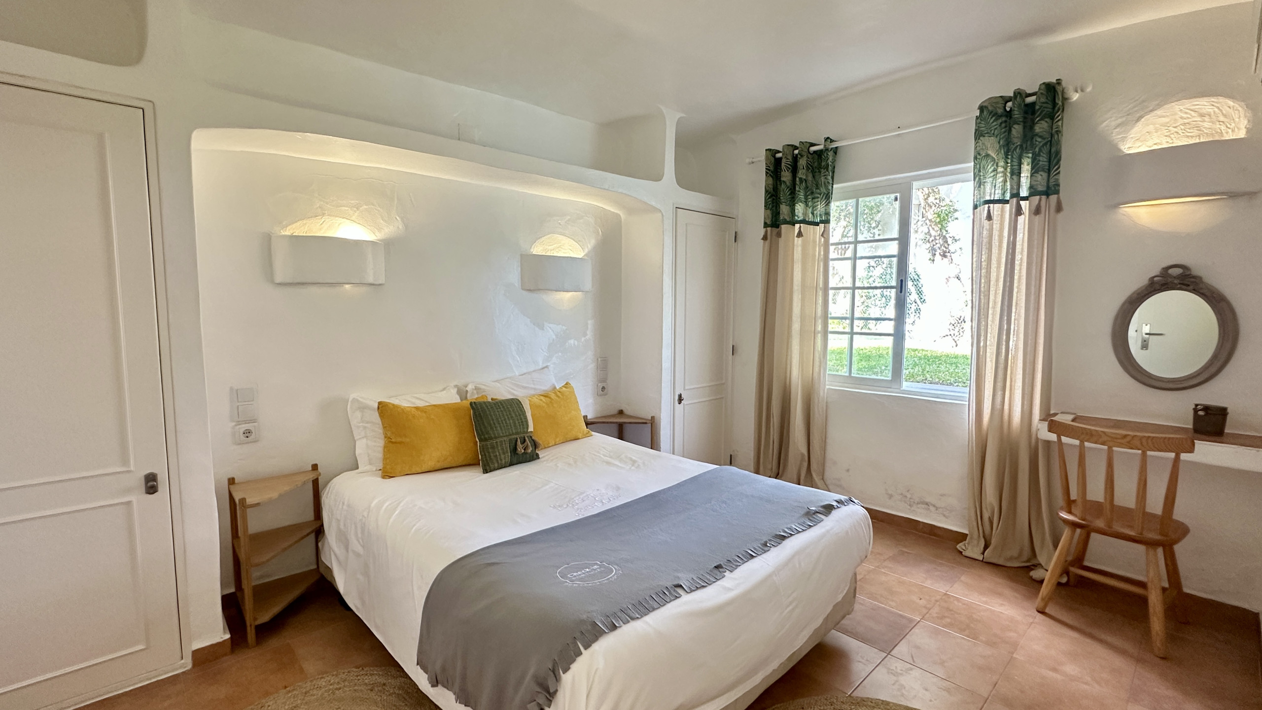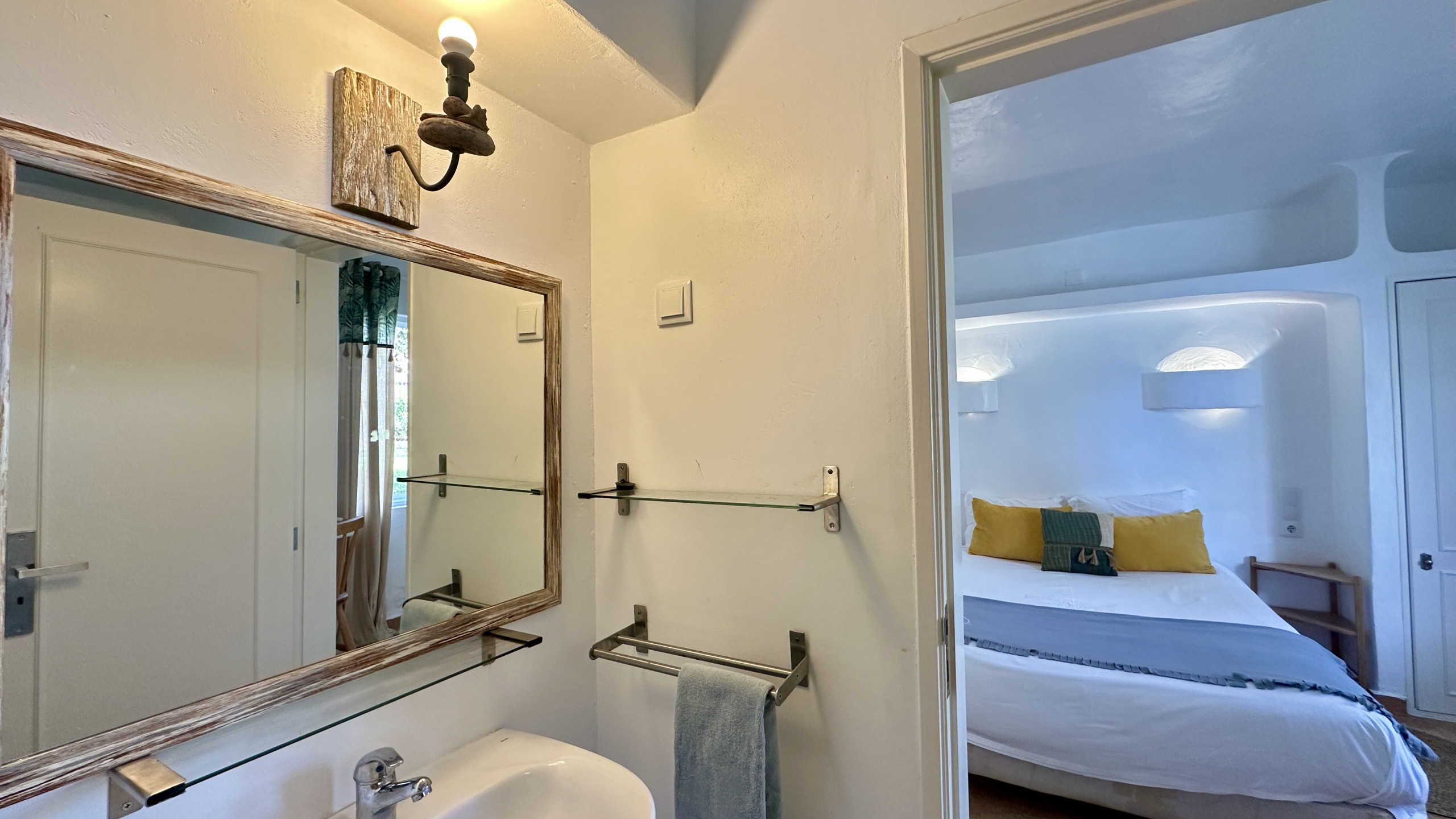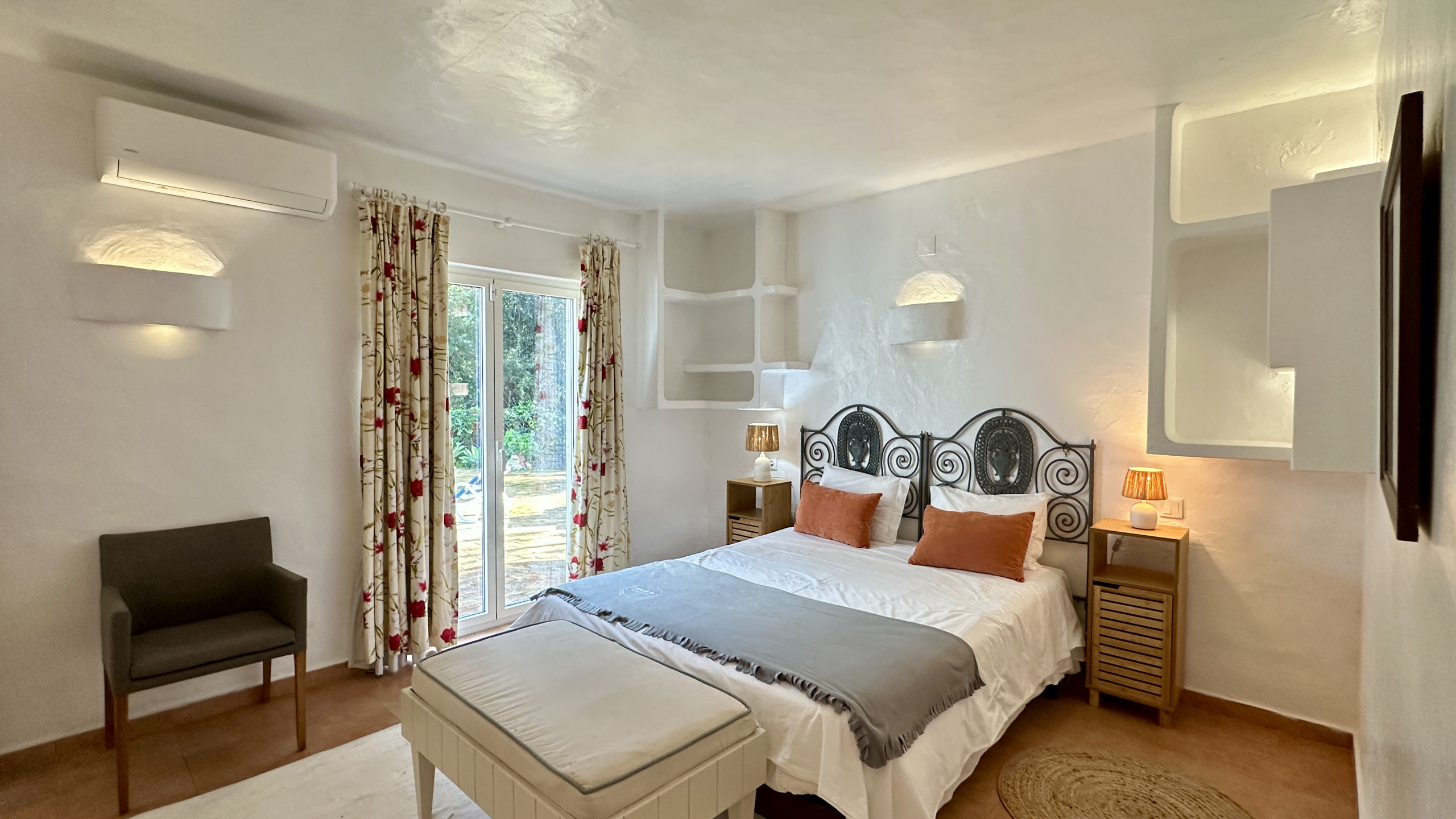 Hauptsuite mit Doppelbett, eigenem Badezimmer und direktem Zugang zur Terrasse und zum Pool
