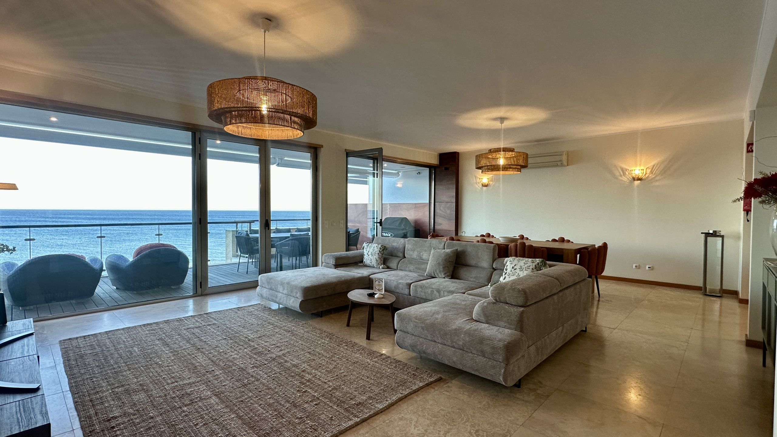 • Geräumiges und elegantes Wohnzimmer mit Essbereich und direktem Zugang zum Pool