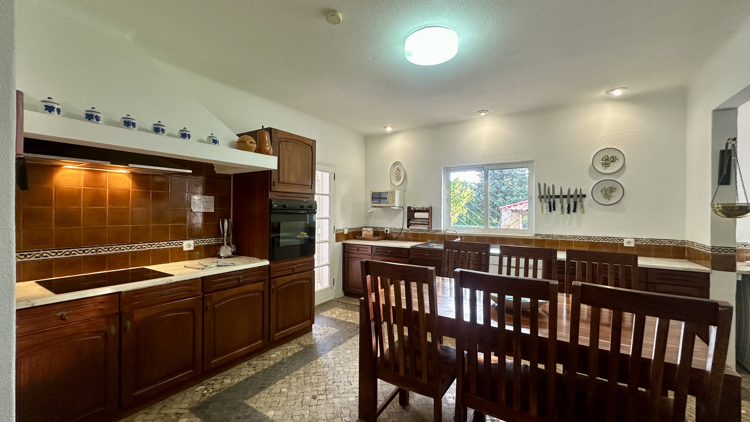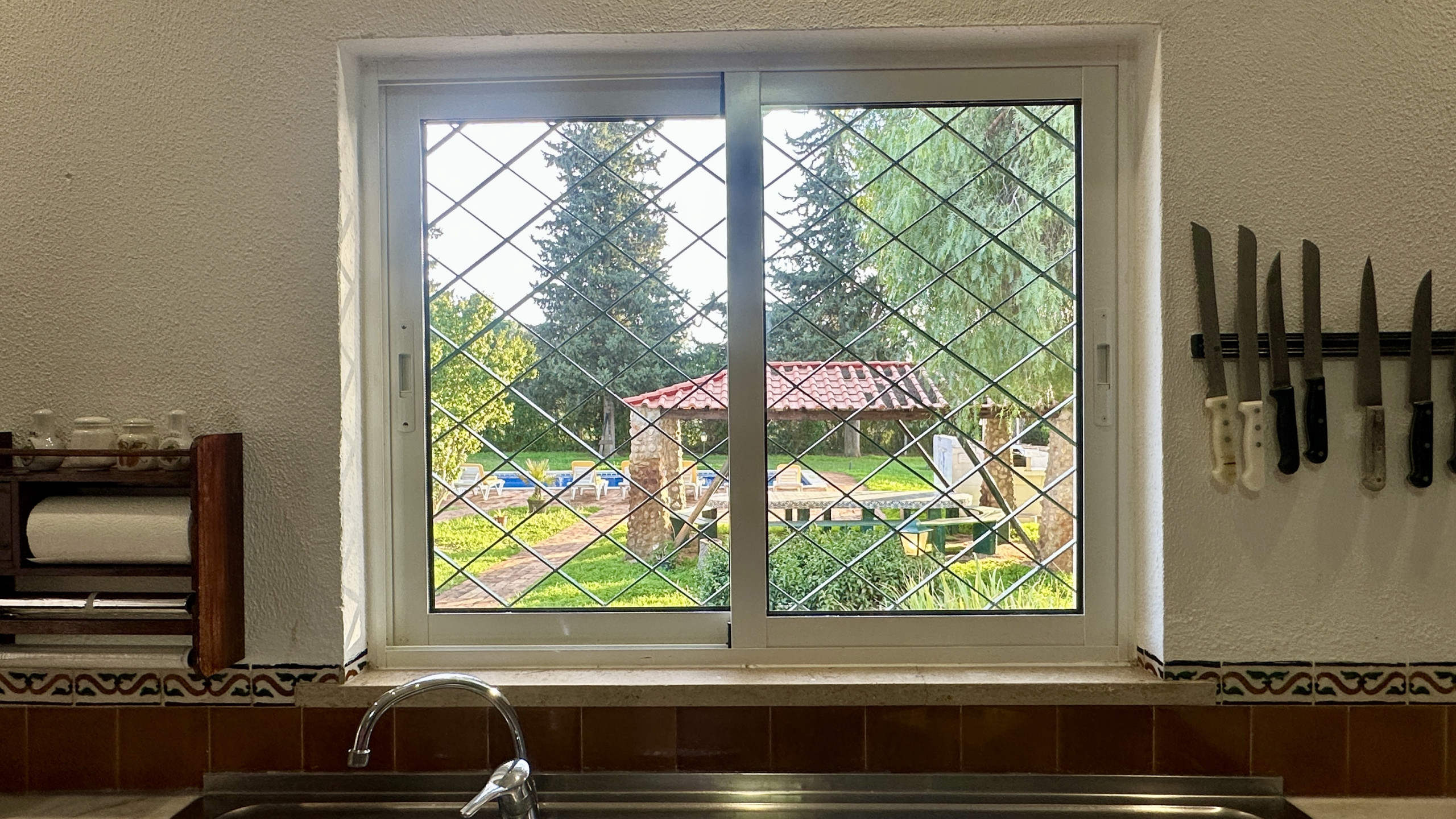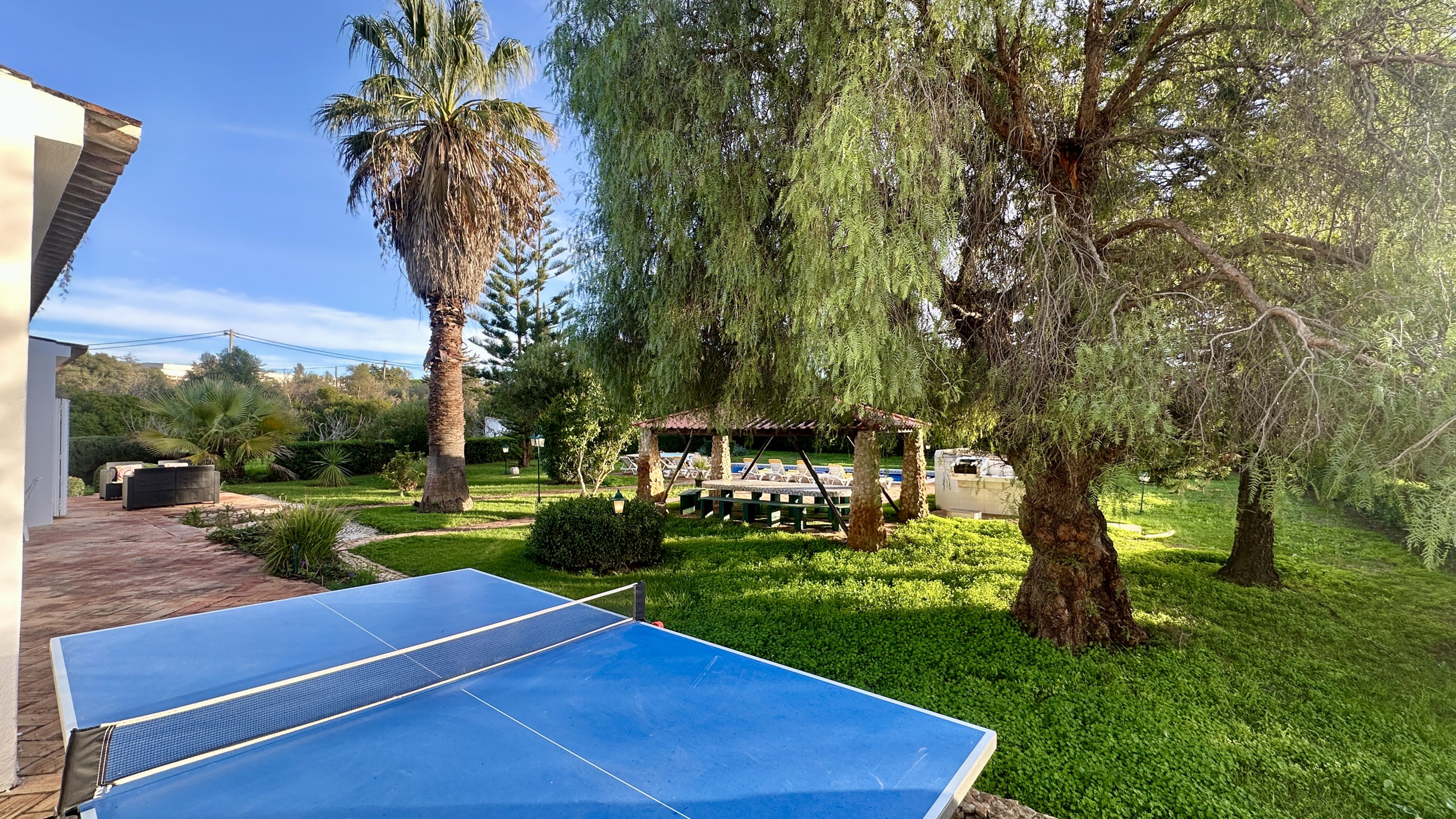 • Überdachte Grillzone mit festem Tisch und direktem Blick auf den Pool, ideal für lange Zusammenkünfte