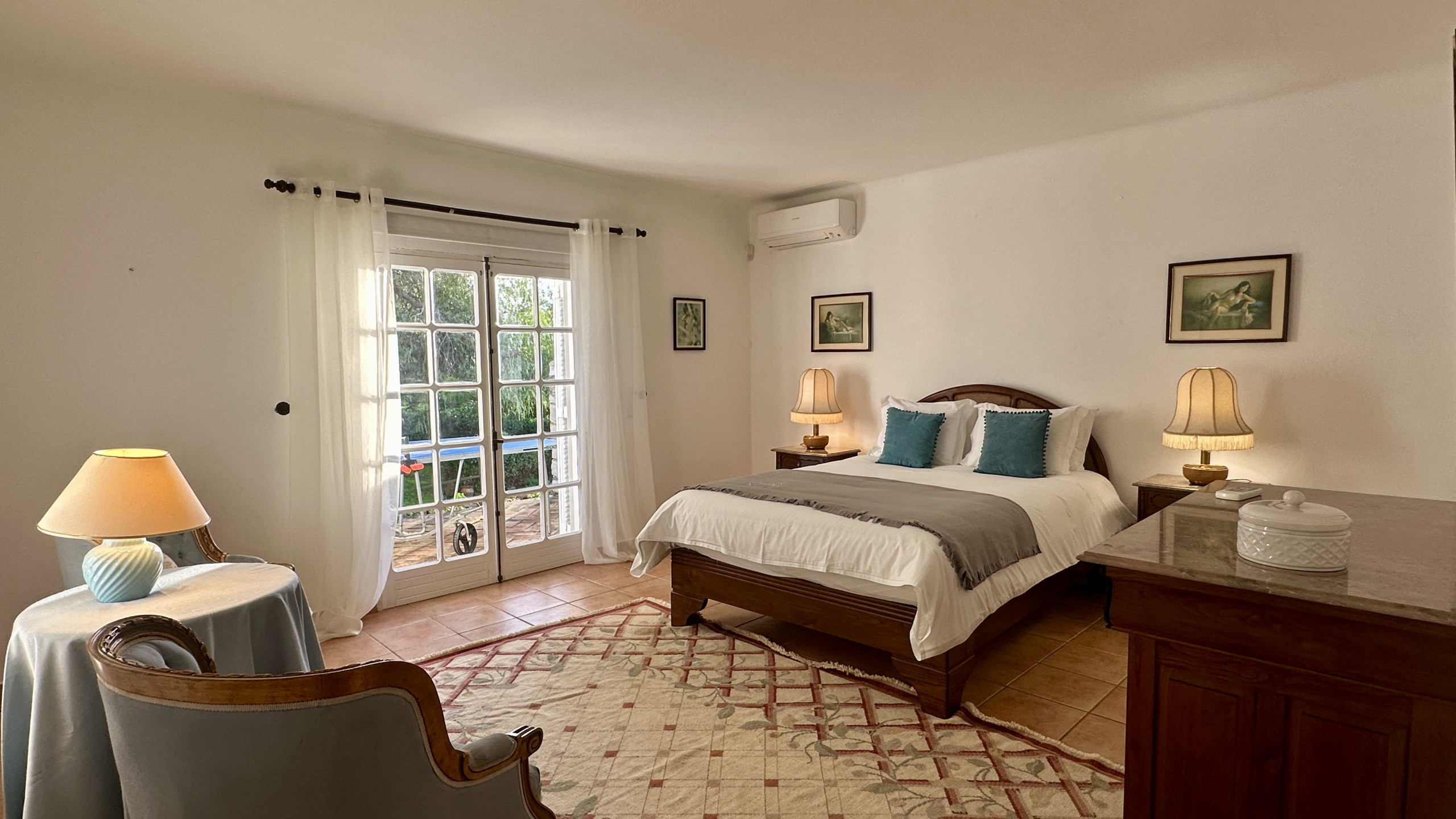 • Hauptschlafzimmer mit Doppelbett, direktem Zugang nach draußen und eigenem Badezimmer mit Dusche.