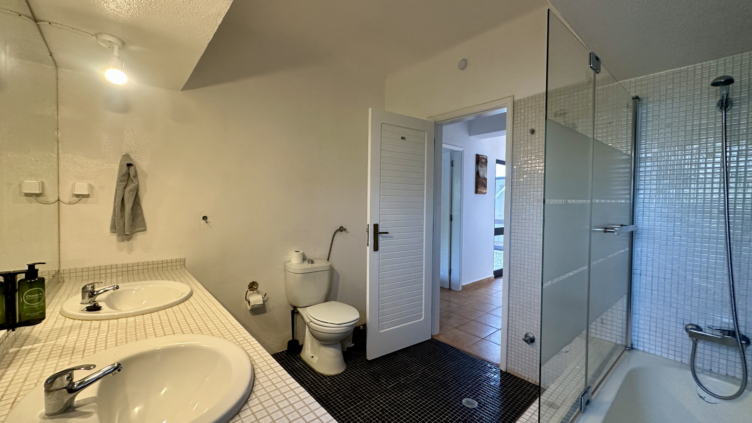 • Drei Zimmer, die sich ein geräumiges Badezimmer mit zwei Waschbecken und Badewanne teilen: