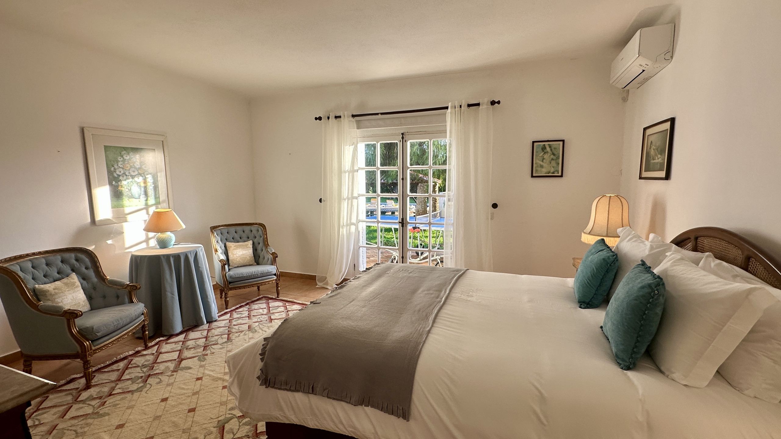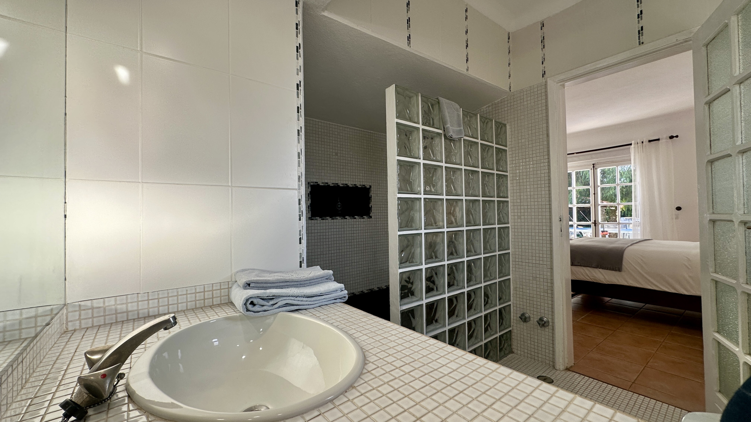 • Chambre principale avec lit double, accès direct à l'extérieur et salle de bain privative avec douche.