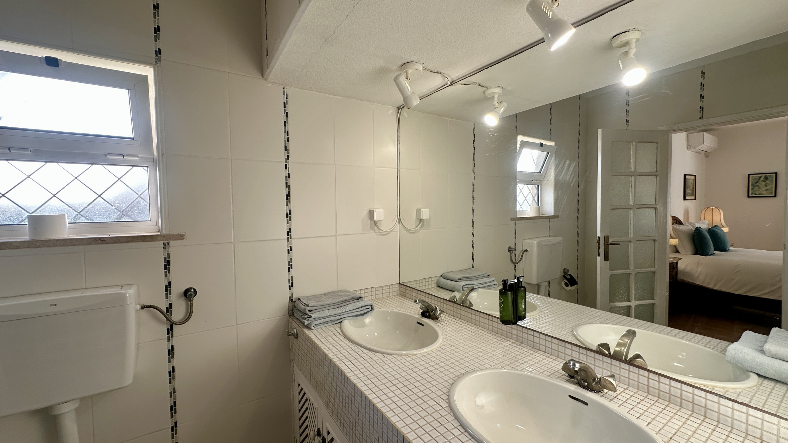 • Trois chambres partageant une salle de bain spacieuse avec deux lavabos et baignoire :